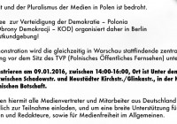 Rede des Chefredakteurs von „POLEN und wir“ und Vorstandsmitglied der Deutsch-Polnischen Gesellschaft der Bundesrepublik Deutschland e.V., Karl Forster, auf der Kundgebung gegen die Einschränkung der Medienfreiheit in Polen, am 9. Januar 2016 in Berlin: Liebe Freunde Eine Art staatsgelenktes Fernsehen wollte Bundeskanzler Konrad Adenauer 1961 einführen, als Alternative zu den ARD-Programmen. Doch das Bundesverfassungsgericht verbot… Weiterlesen »