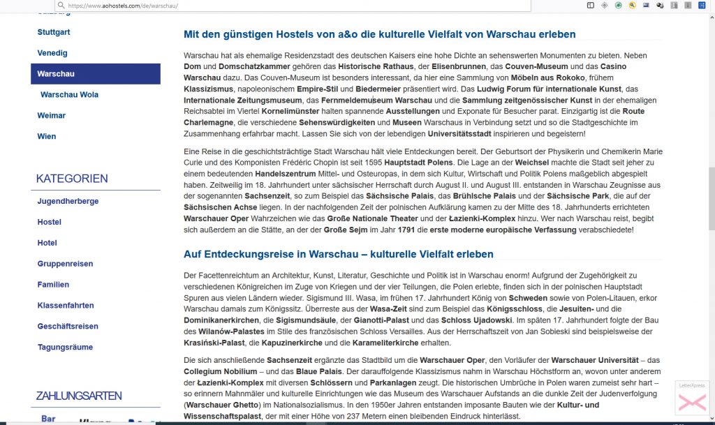 „Unser neu eröffnetes a&o Warschau Wola ist der perfekte Ausgangspunkt, um die schönen Schlösser, Parkanlagen, kulturellen Einrichtungen, Restaurants und Cafés sowie viele weitere Attraktionen Warschaus zu erkunden“, wirbt a&o auf seiner Webseite. Doch dann wird es eine Zumutung: „Warschau hat als ehemalige Residenzstadt des deutschen Kaisers eine hohe Dichte an sehenswerten Monumenten zu bieten“, wird da behauptet. Nun residierte in Warschau zwar der polnische König, nie aber der deutsche Kaiser. Wüsste man nicht, worher der falsche Text stammt, könnte man leicht eine politische Intrige vermuten. Doch wenn man weiterliest, wird deutlich: Da hat jemand den Werbetext der eigenen Webseite für das a&o-Hostel in Trier genommen und einfach den Namen Trier gegen Warschau ausgetauscht. So heißt es dann: “